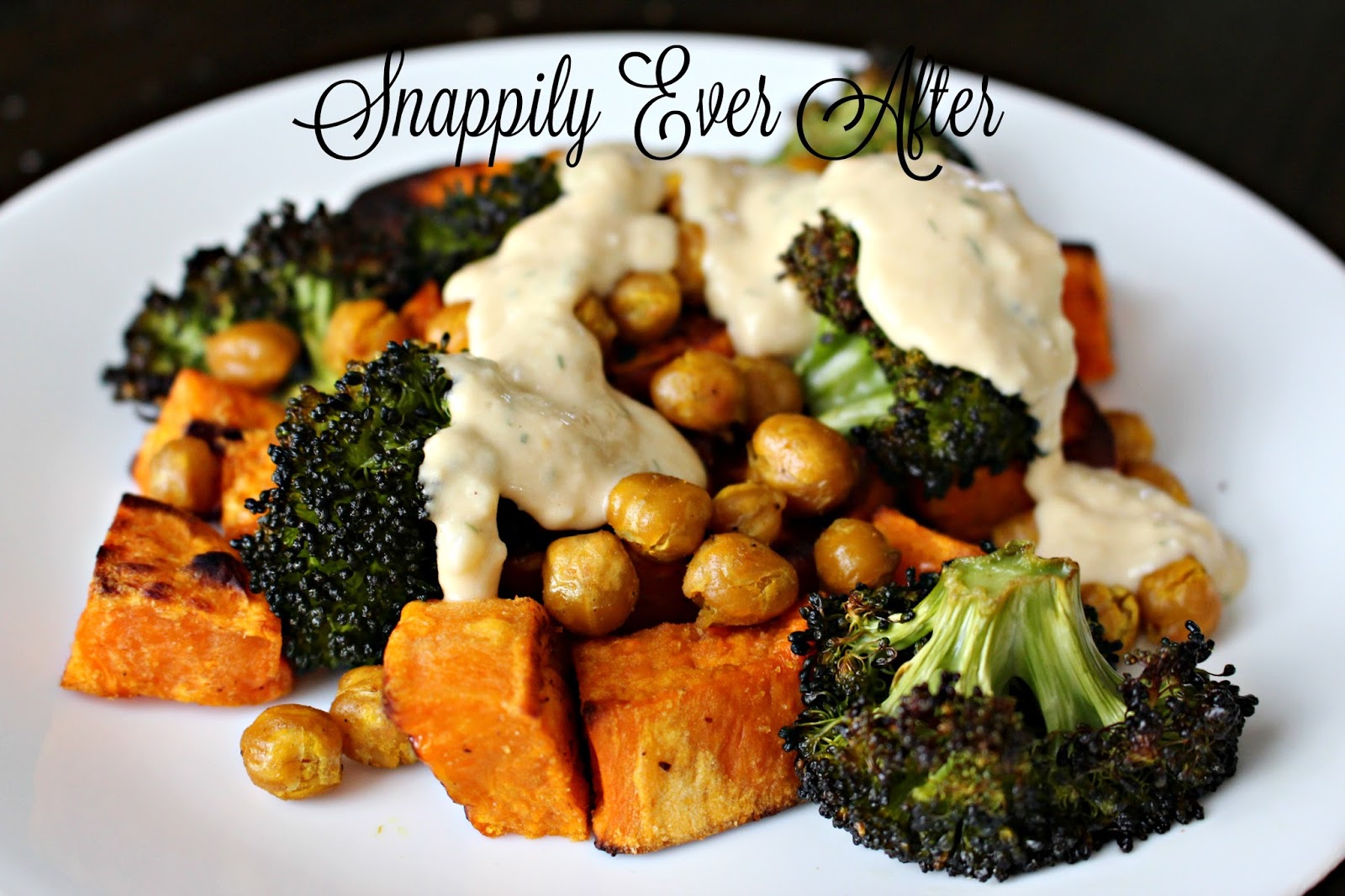 Bake both for a total of 20-25 minutes, rotating the pans once near the halfway point. You can flip the sweet potatoes over to encourage even baking, but it's not necessary. You'll know the broccoli is done when it's golden brown, the sweet potatoes will be tender, and the chickpeas will begin firming up and taking on a slight crunch. Set aside.